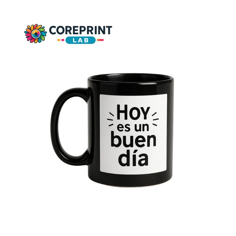 Una taza elegante y sobria que resalta tu diseño con una ventana blanca al frente, perfecta para frases, logotipos o ilustraciones minimalistas.